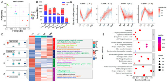 We obtained 79.54 G of raw data from 12 libraries, separated into four groups named D0, D4, D8, and D12 (n = 3). The cleaned samples achieved a read score Q30 of 97% and GC content of no less than 45% (Supplementary Table S1). The PCA results indicated high similarity within groups (Figure 2A). Pairwise comparisons revealed 4566 DEGs across the four groups (Figure 2B, Supplementary Table S2). The expression patterns of the seven genes were quantified against the RNA-seq data, indicating that the RNA-seq results were accurate and reliable (Supplementary Figure S2). Time-series gene clustering analysis categorized the differentially expressed genes into four clusters (C1–C4) (Figure 2C, Supplementary Table S3). During pig chondrocyte development, the expression levels of 1263 DEGs associated with metabolic processes exhibited an initial decrease, followed by a subsequent increase in C1. The expression levels of 827 DEGs related to cartilage development showed a gradual increase with C2 expression. Additionally, the expression levels of 918 DEGs associated with vasculature development gradually increased at the C3 stage. Furthermore, the expression levels of 1436 DEGs related to cell cycle regulation showed an initial increase followed by a subsequent decrease in the C4 group (Figure 2D). The top five significantly enriched pathways in each cluster were identified (Figure 2E).