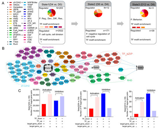 To predict the directional interactions between the regulatory DEGs and regulated DEGs in each transcriptional state, we used TF DNA-binding motif data to establish the relationships between differentially expressed TFs and regulated DEGs. Furthermore, we established the gene regulatory network (GRN) in the three transcriptional states (Figure 3B). In this network, the largest number of TFs were activated to regulate state 1. The TF families, including zf-C2H2, homeobox, TF_bZIP, and RHD, were the most active because they had the largest TF count in transcriptional state 1. HES1, FOS, BACH2, and NFATC4 were involved in more than one transcriptional state. Notably, the total number of target DEGs increased with transcriptional activation and inhibition was the largest in each comparison group, consistent with the largest number of increased DEGs (Figure 1B and Figure 3C, Supplementary Table S5).