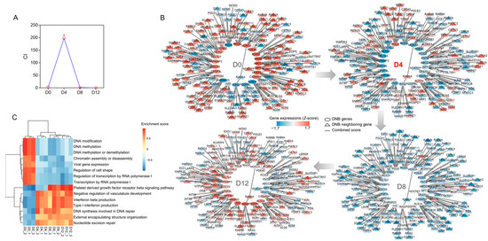 Dynamic network analysis of PVC development. (A) Criticality index (CI) scores at each time point of PVC development. The score was higher for D4 than for other time points, indicating that D4 was the differentiation tipping point. The asterisk (*) indicates the peak value. (B) Dynamic expression of DNBs and adjacent DEGs at different developmental stages. (C) Gene set variation analysis of all genes in the DNB member-centered network. Enrichment scores of the top 15 significant GO terms were analyzed for each sample based on the gene-set expression levels for each term.