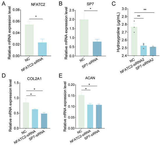 Effect of NFATC2 or SP7 knockdown on PVC development. PVCs were treated with NFATC2 or SP7 siRNAs or NC (negative control). After 48 h, cells were collected to detect their mRNA expression levels of (A) NFATC2, (B) SP7, (D) COL2A1, and (E) ACAN. (C) After 4 days, the cell supernatant was collected for hydroxyproline content analysis. * p < 0.05, ** p < 0.01.