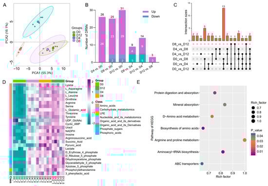 Characteristics of PVC energy metabolomics at various time points during differentiation. (A) PCA of all metabolites in the energy metabolome. (B) Summary of the DRM count across any two comparison groups. (C) UpSet plot of six comparison sets, displaying the number of common and unique DEGs. (D) Heatmap of 26 DRMs at four time points of PVC differentiation, based on the metabolite content of 20 samples. (E) KEGG enrichment analysis of 26 DRMs.
