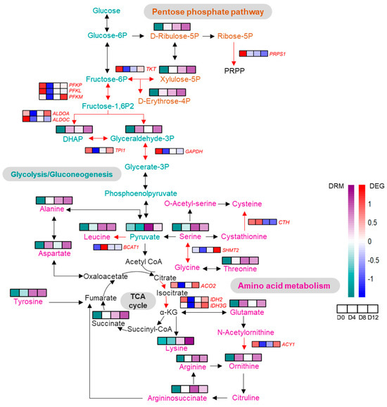 To better understand the interactions between DEGs and variation in metabolic pathways during PVC development, we also mapped DEG–DRM regulatory processes, including glucose metabolism, amino acid metabolism, and the TCA cycle (Figure 7). Notably, these metabolic processes together comprised the “biosynthesis of amino acids” pathway, indicating that DEGs and DRMs act synergistically during chondrocyte differentiation. In the pentose phosphate and amino acid metabolism pathways, metabolites are converted into one other. This process appears to be only partially dependent on variations in the expression of associated enzyme-encoding genes. Overall, metabolite levels were not synchronized with changes in the abundance of enzyme-encoding genes.