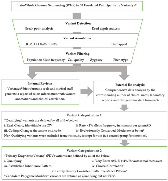 This study was approved by the Advarra IRB (Institutional Review Board, human subjects committee, cirbi@advarra.com accessed on 23 December 2023) as a retrospective chart review of clinical records already available to the corresponding author prior to 1 March 2023. No additional testing was performed for the purpose of this study. The trio-WGS in our 50 subjects were all evaluated in the 15-month interval from December 2021 to February 2023, which is a few months following the last major update to Variantyx® interpretation software (https://www.variantyx.com, accessed on 23 December 2023).