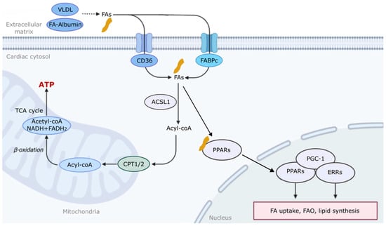 Overview of fatty acid metabolism in the heart. Exogenous fatty acids (FAs) are delivered to cardiomyocytes via albumin in the blood or hydrolyzed from triacylglycerols contained in very-low-density lipoproteins (VLDLs). FAs move across cell membranes through “flip-flop” passive translocation, as well as by active transport via FA translocase (FAT/CD36) and cytoplasmic fatty acid binding proteins (FABPs). FAs are converted to Acyl-CoA by the enzyme acyl-CoA synthetase-1 (ACSL1). Short- and medium-chain FAs can directly enter the mitochondria, while long-chain variants require the carnitine palmitoyltransferase system (CPT 1/2). Inside the mitochondria, fatty acyl-CoA undergoes β-oxidation to produce acetyl-CoA, which enters the tricarboxylic acid (TCA) cycle, flavin adenine dinucleotide (FADH2), and nicotinamide adenine dinucleotide (NADH) to generate adenosine triphosphate (ATP). Free FAs also activate peroxisome proliferator-activated receptors (PPARs). PPARs, peroxisome proliferator-activated receptor gamma coactivator 1 (PGC-1), and estrogen-related receptors (ERRs) control the transcription of genes essential for FA transport and β-oxidation and lipid synthesis in the nucleus.