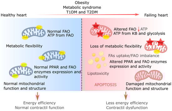 Overview of energy metabolism and cardiac remodeling in a healthy heart and a failing heart. A healthy heart has an energy metabolism mainly dependent on fatty acid oxidation (FAO) to produce adenosine triphosphate (ATP). Fatty acid (FA) metabolism is closely regulated by different enzymes and transcription factors, such as peroxisome proliferator-activated receptors (PPARs), which, together with a normal mitochondrial function and structure, ensure energy efficiency and normal contractile function of the heart. Obesity, metabolic syndrome, and diabetes mellitus types 1 and 2 (T1DM and T2DM, respectively) have consequences at the cardiac level, generating a failing heart. This condition is associated with altered FAO and lower ATP production. The loss of metabolic flexibility causes the heart to produce ATP mainly from the metabolism of ketone bodies (KBs) and glycolysis. There is also an imbalance between the uptake of FAs into the mitochondria and FAO, leading to lipotoxicity and the production of reactive oxygen species (ROS). Moreover, in the failing heart, the expression and function of PPARs and FAO are altered. Finally, damage to mitochondrial function and structure also occurs. All these alterations together can potentially lead to cell death through apoptosis. As a result, the failing heart has less energy production and contractile dysfunction.
