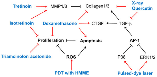 The biological effects of several existing treatments and quercetin on keloid-derived fibroblasts (KFs). Sharp arrows indicate stimulation or upregulation and blunted arrows indicate inhibition or downregulation. Black lines indicate the interaction between cellular factors and events (black letters) and red lines indicate the effects of various treatments (blue letters).