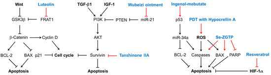 Luteolin decreased the KF viability and the expression levels of cyclin D1, BCL-2, and FRAT1, and increased cell apoptosis, p21, and BAX expression [113]. The pro-apoptotic effects of luteolin were abolished by overexpressed FRAT1, a GSKβ3 inhibitor causing β-catenin activation in the Wnt signaling pathway, and siRNA-mediated FRAT1 depletion increased cell apoptosis [113].
