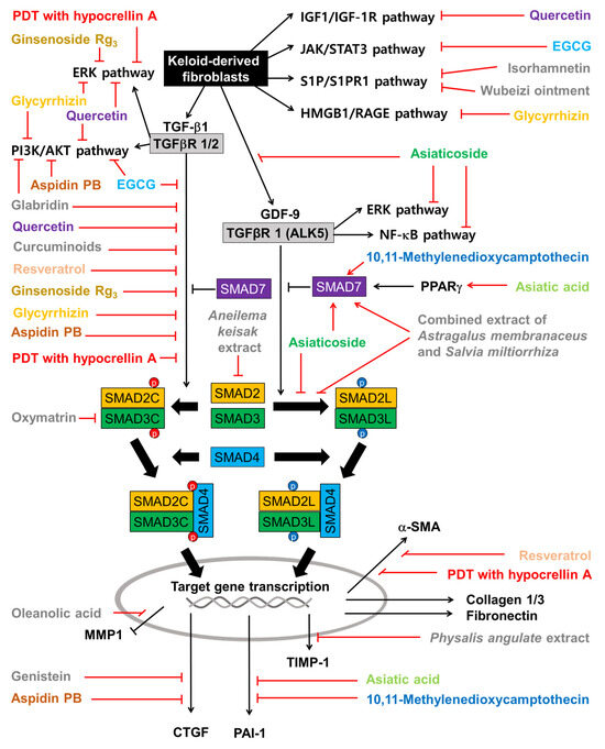 Activation of either SMAD-dependent or -independent pathways results in the increased transcription of target genes, such as collagen, fibronectin, and other ECM components [31,32]. Therefore, targeting these TGF-β signaling pathways will inhibit cell proliferation and collagen synthesis, which can help prevent and treat keloids.