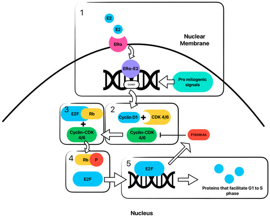 Cyclin-CDK-E2F-Rb pathway with estrogen signaling resulting in amplification of cyclin D is shown. In box 1, estrogen (E2) binds with estrogen receptor (ER) and is translocated to the nucleus, where it, then promotes the transcription of the CCND1 gene resulting in cyclin D1. Pro-mitogenic signals and other pathways can also amplify cyclin D1 transcription, which is discussed elsewhere. In box 2, cyclin D1 then binds with cyclin-dependent kinase (CDK) 4 and 6 to create an activated holoenzyme. In box 3, this cyclin-CDK 4/6 complex phosphorylates retinoblastoma protein (Rb), which results in the dissociation of Rb from the E2F transcription factor seen in box 4. In box 5, the now free E2F transcription factor promotes the downstream cascade of protein synthesis, ultimately transitioning the cell from G1 to S phase. Further, E2F transcribes the CDK2NA gene, which results in the synthesis of p16INK4a, a potent inhibitor of the cyclin-CDK 4/6 complex. This results in a negative feedback loop, which arrests the progression of the cell cycle.