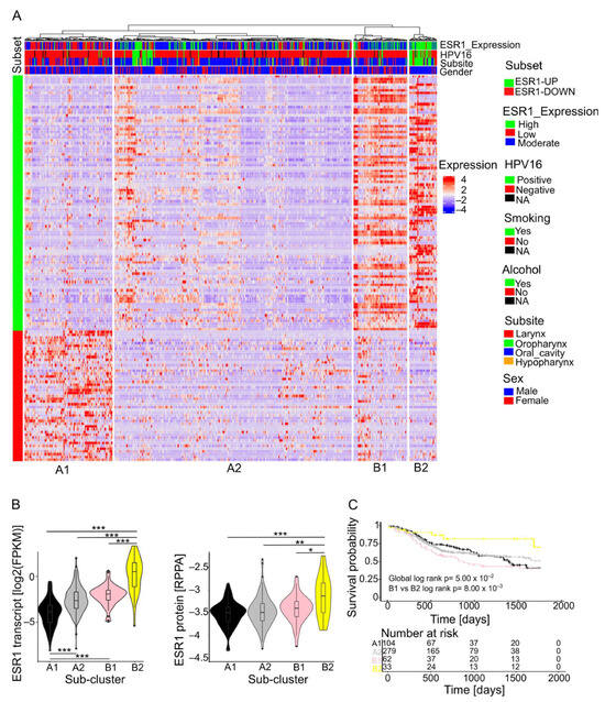 HNSCC subgroups based on the ESR1-related 139-gene set. (A) Heat map shows an unsupervised hierarchical clustering of cases from TCGA-HNSC based on transcript levels of the ESR1-related 139-gene set and their association with indicated risk factors and clinical variables; (B) violin plots show ESR1 transcript (left) or protein levels (right) for individual subclusters; (C) Kaplan–Meier plot showing the 5-year overall survival for each subcluster. Numbers of patients at risk at the indicated time points are given below the graph. * p ≤ 0.05, ** p < 0.005, *** p < 0.0005.