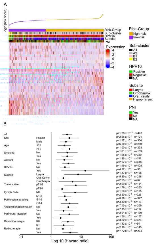 RNA-seq data (FPKM) for the HNSC training cohort (n = 500) and other solid tumors from TCGA (TCGA-PRAD (n = 491), TCGA-PAAD (n = 176), TCGA-ESCA (n = 163), TCGA-LIHC (n = 369), TCGA-GBM (n = 159), TCGA-BLCA (n = 404), TCGA-LUAD (n = 504), TCGA-OV (n = 374), TCGA-BRCA (n = 1089), TCGA-COAD (n = 453), TCGA-LUSC (n = 494), TCGA-UCEC (n = 542), TCGA-KIRC (n = 529), and TCGA-CSCC (n = 303)) were downloaded (accessed on 10 October 2020) from GDC data portal using the Subio platform available at https://www.subioplatform.com. Protein expression (RPPA), clinical, and survival data for TCGA cohorts were downloaded from cBioPortal (TCGA, Firehose Legacy) at https://www.cbioportal.org/study/summary?id=hnsc_tcga (accessed on 13 November 2020). RNA-seq (RSEM) and clinical data for the CPTAC-HNSC cohort were downloaded from LinkedOmics portal at http://linkedomics.org/login.php (accessed on 5 August 2021).