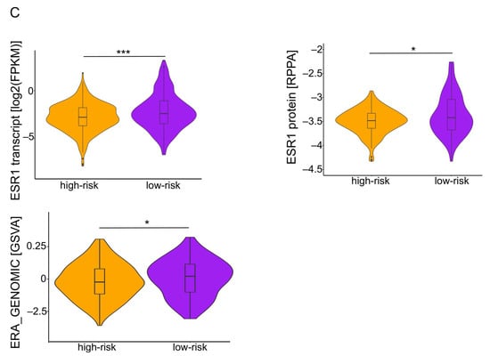Gene set variation analysis (GSVA) was used to calculate the enrichment scores for the selected gene set “PID_ERA_GENOMIC_PATHWAY”, downloaded from the MsigDatabase https://www.gseamsigdb.org/gsea/msigdb/ (accessed on 1 November 2023) using the GSVA package [19] in R studio (3.6.0). Significant differences in GSVA scores between groups were tested with a two-tailed t-test.