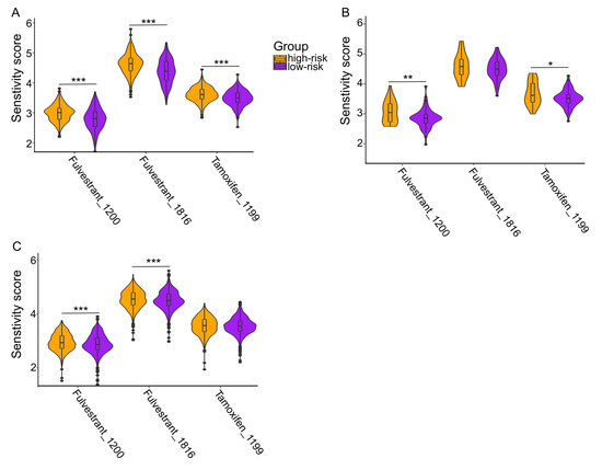 Imputed drug response for an ERα modulator and degrader. Violin plots show lower drug sensitivity scores of fulvestrant and tamoxifen for tumors of low-risk group patients in TCGA-HNSC (A), CPTAC-HNSC (B), and the combined cohort of other solid tumors from TCGA (C). * p ≤ 0.05, ** p < 0.005, *** p < 0.0005.