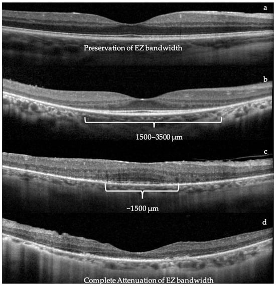 Examples of ellipsoid zone (EZ) bandwidth: (a) normal EZ; (b–d) progression of EZ degeneration to (b) EZ 1500–3500 µm, (c) EZ 1500 µm, and (d) complete attenuation of EZ.