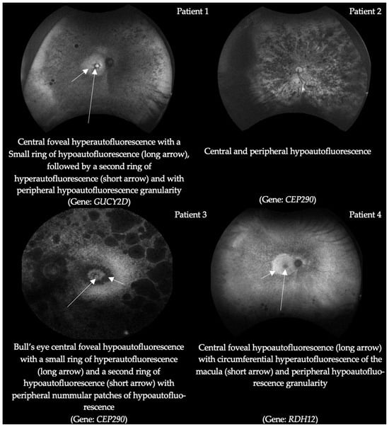 A well-cited classification system developed by Foxman distinguishes the difference between complicated/uncomplicated LCA, juvenile RP, and early-onset RP []. However, this study does not consider the patient’s genetic profile since it was developed in 1985. The main criteria for this classification system utilize the onset of disease and ERG results. To note, there is ambiguity in this LCA classification system based on the non-reproducible ERG results and the difficulties in determining the exact onset of disease presentation [,]. Because of the clinical and genetic heterogeneity, in addition to the lack of a clear definition for LCA, we characterized our cohort as a continuum of phenotypes, considering the personal history, clinical examination, multimodal imaging findings, electroretinogram, and genetic testing results.