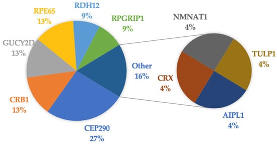 LCA is primarily inherited in an autosomal-recessive manner. Various distinct phenotypes have been described (LCA1-19) as being associated with genetic variants in at least 29 different genes. The most frequent genetic causes of LCA are attributed to the CEP290 (15%), GUCY2D (12%), CRB1 (10%), and RPE65 (8%) genes and account for 70–80% of known cases [].