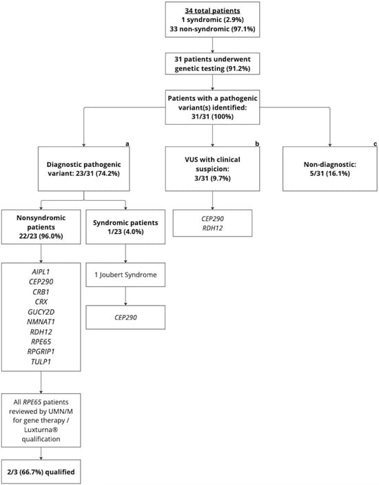A total of 31/34 (91.2%) patients had genetic testing completed at the time of this study. The two patients who did not undergo genetic testing were adults (>18 years old) with LCA that was clinically diagnosed in childhood. They chose not to undergo genetic testing due advanced disease presentation with no available treatment options. All patients who underwent genetic testing had at least one pathogenic and/or likely pathogenic variant identified. Figure 3 shows the distribution of the causative genes found in our LCA patient cohort. The top causative genes include CEP290 (26%), CRB1 (13%), GUCY2D (13%), RPE65 (13%), RDH12 (9%), and RPGRIP1 (9%). A detailed summary of the genetic testing and corresponding results is provided in Figure 4. Of those who underwent genetic testing, 23/31 (74.2%) patients had a diagnostic pathogenic/likely pathogenic variant identified (Figure 4a). This percentage reflects the diagnostic yield rate for our LCA patient cohort. Within this subgroup, 22 patients were non-syndromic and one was syndromic. The syndromic patient was determined to have Joubert syndrome. Moreover, 3/31 (9.7%) patients only had VUSs on genetic testing, but based on correlative LCA clinical presentation, we were suspicious of the possible diagnostic value of the VUS (Figure 4b). The final 5/31 (16.1%) patients were found to be non-diagnostic (Figure 4c).