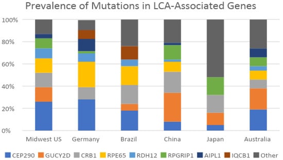 Prevalence of mutations in LCA-associated genes. The studies included the Midwest US (our cohort), Germany [], Brazil [], China [], Japan [], and Australia [].