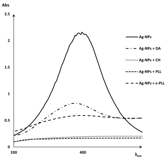 UV-vis spectra of Ag-NPs peak and Ag-NPs + APs (CH, DA, PLL, and ε-PLL).