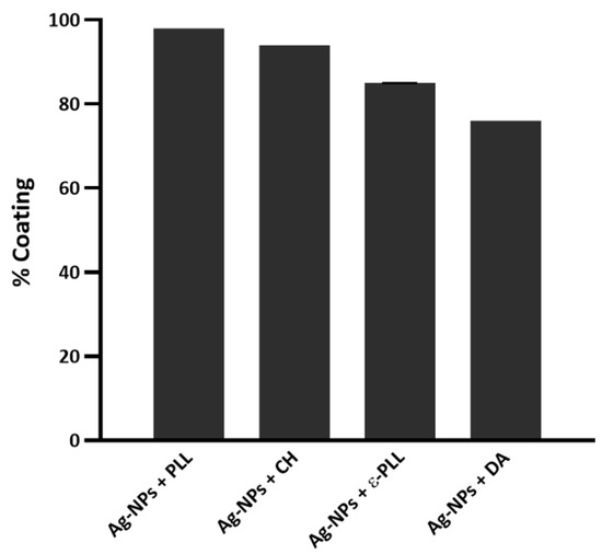 Then, the coating yield of Ag-NPs by APs was calculated (Figure 2), and it was observed that (i) after 2 h of incubation, the Ag-NP coating effect with PLL was about 98%; (ii) the CH polymer also presented a good performance, which coated approximately 94% of Ag-NPs after 4 h of incubation; (iii) for the Ag-NPs + ε-PLL, the coating effect reached 85% after 2 h of incubation; and lastly, (iv) DA coated about 76% of Ag-NPs.