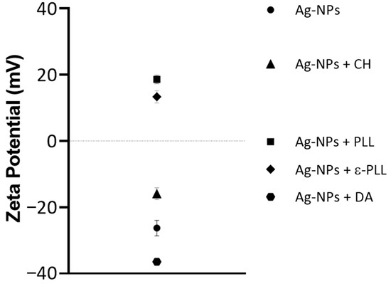 To further confirm the interaction between the polymer and Ag-NPs, the zeta potential of each formulation was measured (Figure 4). Ag-NPs initially have a negative zeta potential of −26.3 ± 4.053 mV (as expected due to the citrate coating). Still, their charge increases to 18.6 ± 2.170 and 13.3 ± 3.216 mV after PLL and ε-PLL coatings, respectively, which was also expected since these polymers are positively charged molecules [56,60]. With the CH coating, the charge also increases to −15.9 ± 3.079 mV; however, it remains slightly negative, which can be because NaOH was used in the formulation of Ag-NPs + CH. The pH was altered from acidic to alkaline, and the amino groups on CH might have lost their positive charge, with the coating becoming negatively charged [61,62]. Ag-NPs + DA present a zeta potential of −36.4 ± 1.097 mV since the DA molecule presents several phenolic and catechol functional groups that lead to a higher negative charge on the surface of NPs [63,64]. The changes in the zeta potential of the uncoated Ag-NPs to the Ag-NP + AP formulations are, therefore, further evidence of the Ag-NP surface modification and complexation with the polymers.