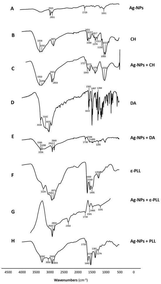 FTIR spectra of Ag-NP (A), CH (B), Ag-NP + CH (C), DA (D), Ag-NP + DA (E), ε-PLL (F), Ag-NP + ε-PLL (G), and Ag-NP + PLL (H) compounds and the signalized relevant peaks.