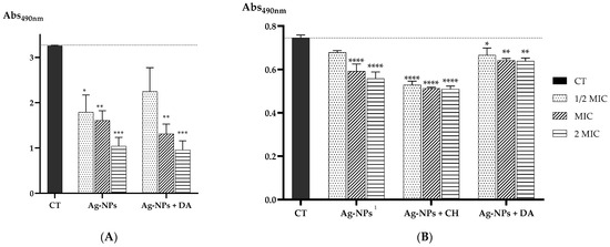 Similarly, for the C. albicans strain (Figure 6B), a better effect was obtained for the nanoconjugates considering the use of 20, 40, and 80 µg/mL for Ag-NPs, 5, 10, and 20 µg/mL for Ag-NPs + CH, or even 2.5, 5, and 10 µg/mL for Ag-NPs + DA. Lower concentrations of nanoconjugates allowed a similar profile in the reduction in the preformed biofilm in comparison with Ag-NPs. From these results, we can gather that the Ag-NP + CH formulation seems to be the best in reducing the viability of the biofilm.