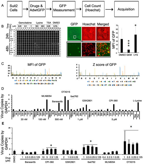 Each compound in the library, a unique collection of 181 molecules enriched in epigenetics compounds, (Cat L1900, Selleckchem, Houston, TX, USA) was resuspended in DMSO as 10 mM and 100 µM stocks and barcoded. A Hamilton Microlab Star liquid handling platform (SPT Labtech, Melbourn, UK) was used for further dilutions to create 384 well-plates of stocks in DMSO. Suit-2 cells (800 cells/well, in 50 µL) were seeded in 384-well flat bottom plates in 10% FBS-DMEM and cultured for 40 h when the media were replaced by 45 µL 2% FBS-DMEM before the addition of the compounds. The robotic protocol design, scheduling, and execution were carried out using the Echo Plate Reformat Application and Echo Liquid Handler instrument (Labcyte Ltd., Sheffield, UK). Drugs were dispensed at final concentrations of 10 nM (5 nL of 100 µM stock), 100 nM (50 nL of 100 µM stock), 500 nM (2.5 nL of 10 mM stock), 1 µM (5 nL of 10 mM stock), and 5 µM (25 nL of 10 mM stock) into individual wells in triplicate plates for each dose. Ad5wtGFP 500 particles per cell (ppc) in 5 µL were added into each well manually. DMSO (0.1%) was added to untreated control cells, positive controls were infected with the virus pre-treated with 10 mM L-lysine and negative controls with 100 nM Gemcitabine. Assay plates were placed in an incubator at 37 °C for 24 h and the Hoechst 33,342 dye (10 μg/mL) was added and incubated for an additional 20 min. The plates were imaged by the Celigo Imaging cytometer (Nexcelom Bioscience, Lawrence, MA, USA); cellular DNA (Hoechst dye) and GFP (AdwtGFP) were detected by excitation at 350 nm/emission at 455 nm and excitation at 490 nm/emission at 525 nm, respectively. GFP expression was quantified as an indirect measure for early viral gene expression and replication per viable cell (Hoechst dye) using the Celigo system (nexelom.com). The quantitative numerical output was % GFP+ cells, total live cell numbers (Hoechst), mean GFP density/well, and integrated mean GFP density/well. All data from triplicate plates were averaged and calculated. Significance was determined by the Z factor according to the following: Z-score = (mean for individual drug − mean for all drugs treated and untreated wells)/STD from all drug-treated and -untreated wells. Samples with Z-scores greater than 2 were selected for a second round of screening analysis by qPCR.