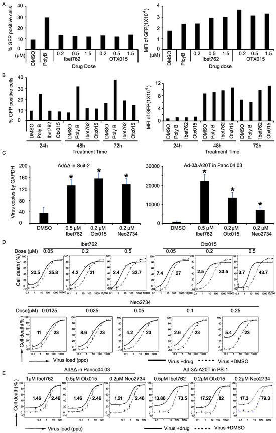 The bromodomain inhibitors iBet-762, OTX-015, and Neo-2734 promote adenovirus replication and cell killing. (A,B) Suit-2 cells were infected with AdwtGFP at 1 pfu/cell, treated with the inhibitors at the indicated doses, and analysed by flow cytometry after 24 h (A) and from 24–72 h (B). (Left panels), percentage of GFP positive cells, (Right panels), mean fluorescence GFP intensity. Polybrene at 6 µg/mL was used as positive control for adenovirus transduction. Averages from triplicate samples, one representative experiment from three studies. (C) Amplification of viral genomes by qPCR in the presence of the inhibitors at the optimal concentrations and infected with Ad∆∆ or Ad-3∆-A20T at 1 pfu/cell. Viral E2A DNA was quantified relative to cellular GAPDH 24 h post-infection, n = 3, * p < 0.01. (D) Suit-2 cells were infected with Ad5wt at increasing doses (0.1–10,000 ppc) ± the inhibitors at the indicated dose levels and viability was determined after 6 days. (E) Panc04.03 cells were infected with Ad5∆∆ and PS-1 cells with Ad-3∆-A20T at increasing doses (0.001–100 ppc) ± the inhibitors at the indicated dose levels and viability was determined after 5 days. (D,E) Data representative of three individual experiments, expressed as % live cells and EC50 values indicated on each graph above (virus + drug) and below (virus alone) the respective line.