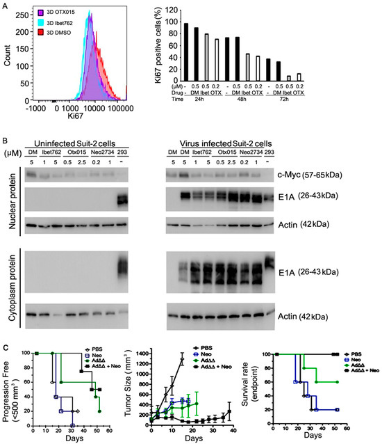 The bromodomain inhibitors attenuate c-Myc expression and promote Ad∆∆ efficacy in Suit-2 xenografts in vivo. (A) Suit-2 cells were treated with DMSO (ctrl), iBet-762 (0.5 µM), or OTX-015 (0.2 µM) for 24, 48, and 72 h, followed by Ki67 staining and flow cytometry. (Left panel), flow cytometry profile from one representative experiment, (right panel), quantification of Ki67 flow cytometry data over time with increasing concentrations of drugs (representative data, duplicate wells), DM = DMSO. (B) Non-infected and infected (Ad5wt) Suit-2 cells were treated with the iBet-762, OTX-015, or Neo-2734 inhibitors at the indicated doses for 24 h. Cells were harvested and cytoplasmic and nuclear protein fractions analysed by immunoblotting (representative blots). c-Myc also served as a nuclear marker, while the early viral gene E1A is highly expressed in the cytoplasm and rapidly enters the nuclei. (C) Neo-2734 promotes Ad∆∆-mediated growth inhibition of Suit-2 subcutaneous xenografts in vivo. Ad∆∆ (1 × 108 vp/dose) was administered intratumourally on days 1, 3, and 5, with or without Neo-2734 (1 µg/µL) administered intraperitoneally on days 1, 2, 3, 4, and 5. (Left panel), progression free survival (tumours < 500 mm3), n = 5 animals/group. Middle panel; average tumour growth curves, n = 5 animals/group. Right panel; overall survival at endpoint (1200 mm3; HO regulations), n = 5 animals/group.