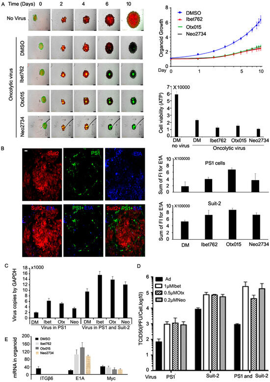 The bromodomain inhibitors promote virus spread and cell killing in 3D co-cultures of Suit-2 PDAC cells and cancer-associated stromal cells PS-1. (A) Growth of Suit-2 cells expressing mCherry (red) and PDAC-associated stromal cells (PS-1) expressing GFP (green) were infected with the oncolytic Ad-3∆-A20T (0.2 ppc) for 2 h ± iBet-762 or OTX-015 or Neo-2734 and embedded in Matrigel. Images were recorded daily by Incucyte up to 10 days; scale bar = 400 µm. (Right upper panel), growth curves corresponding to image data. (Right lower panel), ATP was extracted from the organoids 6 days after inhibitor treatment and analysed by luciferase assay as a marker for cell viability. (B) Spinning disc confocal microscopy images of organoid cultures. Organoids were harvested at 6 days after inhibitor treatment, fixed, permeabilized, and stained for viral E1A (blue); scale bar = 100 µm. Images were recorded and analysed for relative E1A protein expression (right panels) in both Suit-2 (red) and PS-1 cells (green). (C) Organoids were pre-infected with Ad-3∆-A20T, either in PS-1 cells only or in both PS-1 and Suit-2 cells. DNA was extracted from the organoids 6 days after inhibitor treatment and viral genomes were determined by qPCR, n = 3. (D) Viral replication in organoids was determined by TCID50. Either Suit-2 cells or PS-1 cells or both cell lines were pre-infected with Ad∆∆ (0.2 ppc) for 2 h and treated with the inhibitors for 6 days in organoid cultures. Cells and culture media were collected and analysed by TCID50, n = 3. (E) mRNA expression in organoids. Total RNA was extracted from organoids 6 days after inhibitor treatment and mRNA expression for E1A, c-Myc, and αvβ6-integrin (ITGβ6) was analysed by qPCR, n = 3.