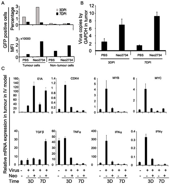 Neo-2734 increases viral replication and distribution in Suit-2 subcutaneous xenografts in vivo. Suit-2 cells (5 × 106) expressing mCherry were implanted subcutaneously in Matrigel (1:1) in NOD2SCID mice. Ad5wtGFP virus (1 × 1010 vp/dose) was administered intravenously when tumours were 100 ± 20 mm3. Neo-2734 (1 µg/µL) or PBS was administered intraperitoneally. Animals were culled at 3 days and 7 days post-infection/treatment, and tumours, liver, and spleen were harvested and processed for analysis. (A) (Upper panel), percentage of GFP-expressing cells at 3 days and 7 days post-infection in tumour and non-tumour tissues (liver and spleen). (Lower panel), mean fluorescence intensity in GFP positive cells as an indication of viral replication/spread in tumour and non-tumour tissues. (B) Virus replication analysed by qPCR with E2A primers in tumour cells harvested 3 days and 7 days after treatment, n = 3/group. (C) Viral and cellular gene expression in tumour tissue 3 days and 7 days post-infection, mRNA analysis by RT-qPCR, n = 3/group.