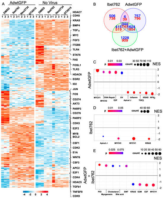 Global effects of Ad5wtGFP and bromodomain inhibitors on viral and cellular transcriptomes. (A) The PDAC Suit-2 cells were infected or uninfected by Ad5wtGFP for 12 h and treated with the inhibitors for another 12 h. GFP-positive cells were isolated by fluorescence activated cell sorting. Total RNA was extracted and subjected to RNA sequencing in biological triplicate samples for each treatment. The heatmap shows the global effects of the virus and inhibitors on the transcriptomes of both cancer cells and adenoviral genes. (Left panel), effects of virus alone in DMSO (left lane) and virus + inhibitors in DMSO (right lanes) compared to control treated cells (DMSO only). (Right panel), effects of each inhibitor alone in DMSO compared to control treated cells (DMSO) on global gene expression. (B) Venn diagram illustrating the interactions of iBet-762, virus, and the combined treatment; red and blue numbers indicate downregulated and upregulated genes, respectively. (C–E) Data analysed by GSEA using Broad Institute Hallmark gene sets [39]. Normalised enrichment scores (NES) and Benjamini–Hochberg adjusted p-values are shown. Positive NES indicate upregulated pathways while negative scores denote that the pathway is downregulated by treatment. AdwtGFP infection alone (C), iBET-762 alone (D), and the combined effects (E).