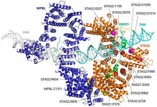 Three-dimensional model showing the relative position of STAG2 (orange) interacting with NIPBL (blue), RAD21 (green), a segment of the N-terminal domain of CTCF (yellow), and a fragment of a DNA molecule (cyan). The model is based on the Protein Data Bank structures 6WG3 [13], 4PJW [17], 6H8Q [14], and 6QNX [12]. The DNA molecule in gray corresponds to the one included in the 6WG3 structure in contact with the NIPBL molecule. Although this interaction was not analyzed in the present work, it has been included in the figure to illustrate its position. The amino acid positions of STAG2, NIPBL, and RAD21, the variants of which are analyzed, are indicated by solid spheres. The interface group they have been assigned to is indicated by the sphere color: STAG2/NIPBL interaction (yellow spheres): STAG2:Arg604Gln (R604), STAG2:Asp659His (D659), NIPBL:Cys1311Arg (C1311), and NIPBL:Cys1311His (C1311); STAG2/DNA interaction (magenta spheres): STAG2:Tyr159Cys (Y159), STAG2:Tyr159His (Y159), STAG2:Arg954Cys (R954), STAG2:Phe999Cys (F999), STAG2:Lys1009Asn (K1009), and STAG2:Asp1014Asn (D1014); STAG2/RAD21 interaction (red spheres): STAG2:Met378Val (M378), STAG2:Gln728His (Q728), STAG2:Arg862Gly (R862), RAD21:Ser345Pro (S345), and RAD21:Pro376Arg (P376); and STAG2/CTCF interaction (cyan sphere): STAG2:Ser327Asn (S327).
