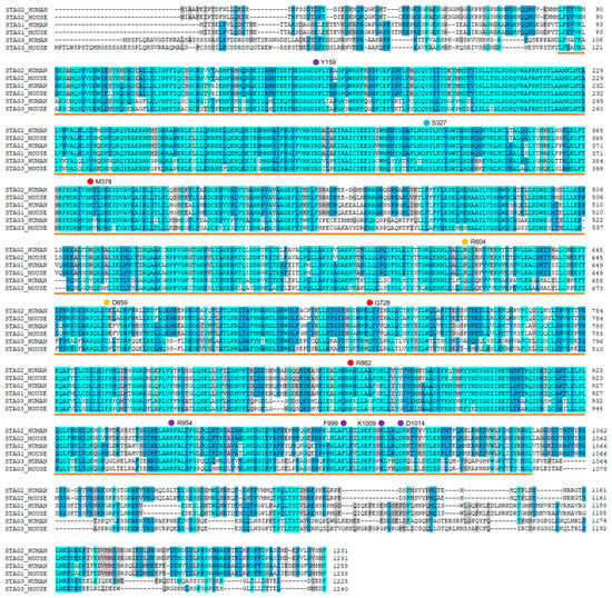 Multiple sequence alignment of mouse and human STAG1, STAG2, and STAG3 proteins (Uniprot entries: Q8WVM7, Q8N3U4, Q9UJ98, Q9D3E6, O35638, and O70576, respectively). The dots indicate the position of the human STAG2 amino acids that were analyzed, colored according to the interface to which each is associated: STAG2/NIPBL interaction (yellow dots): STAG2:Arg604Gln (R604) and STAG2:Asp659His (D659); STAG2/DNA interaction (magenta dots): STAG2:Tyr159Cys (Y159), STAG2:Tyr159His (Y159), STAG2:Arg954Cys (R954), STAG2:Phe999Cys (F999), STAG2:Lys1009Asn (K1009), and STAG2:Asp1014Asn (D1014); STAG2/RAD21 interaction (red dots): STAG2:Met378Val (M378), STAG2:Gln728His (Q728), and STAG2:Arg862Gly (R862); and STAG2/CTCF interaction (cyan dots): STAG2:Ser327Asn (S327). Sequences are colored according to their evolutionary conservation. The STAG2 sequence segment corresponding to the 3D structure is marked with an orange line.
