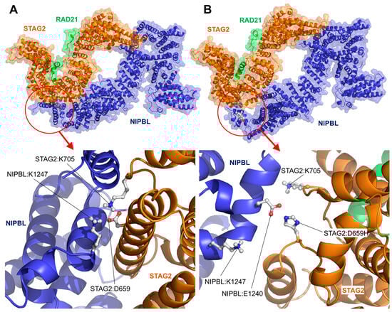 STAG2/NIPBL interaction: STAG2:Asp659His variant. Structure of the interaction interface between NIPBL and STAG2 in presence of the wild-type STAG2:Asp659 residue (A) and variant STAG2:Asp659His (B) after a 200 ns long MD simulation. (Upper panels) Structure of the STAG2-NIPBL complex after MD simulation. (Bottom panels) Zoom on the area where the STAG2:Asp659 residue is located on the interaction surface between the two proteins. (A) The negatively charged residue STAG2:Asp659 (D659) forms a stable interaction with the positively charged amino acids STAG2:Lys705 (K705) and NIPBL:Lys1247 (K1247). (B) The presence of a histidine at the position corresponding to the Asp659 residue in the STAG2:Asp659His (D659H) variant causes the separation of the positive amino acids STAG2:Lys705 (K705) and NIPBL:Lys1247 (K1247) from their original position. Instead, STAG2:Asp659His binds to the residue NIPBL:Glu1240 (E1240). This structural change causes the noticeable disorganization of the neighboring structures and replaces two salt-bridges with a single polar interaction, which can be expected to significantly weaken the interaction between NIPBL and STAG2.