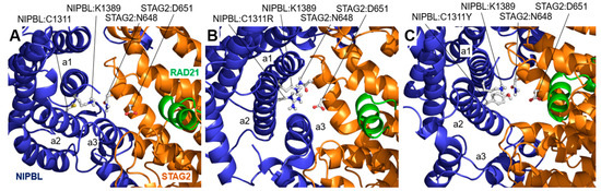 STAG2/NIPBL interaction: NIPBL:Cys1311Arg and NIPBL:Cys1311Tyr variants. Interface between wild type NIPBL and STAG2 in the vicinity of the amino acid NIPBL:Cys1311 (C1311) after a 200 ns long MD simulation. (A) In the wild-type interface, close to the NIPBL:Cys1311 residue (located in an alpha-helix in the HEAT repeat structure, marked (a2)), the amino acid NIPBL:Lys1389 (K1389) (located in the adjacent helix, marked (a1)) interacts with the amino acid STAG2:Asn648 (N648), contributing to the stability of the local structure of the interface between NIPBL and STAG2. (B) In the NIPBL:Cys1311Arg (C1311R) variant, the amino acid NIPBL:Arg1311 interacts with the amino acids STAG2:Asn648 (N648) and STAG2:Asp651 (D651), which causes the displacement of the (a1)- and (a2)-labeled helices of NIPBL during the MD simulation, locally disorganizing the interface structure. (C) A similar effect is observed for the NIPBL:Cys1311Tyr (C1311Y) variant, where the structural change is enhanced by the large displacement of a third helix of the HEAT repeat structure of NIPBL, labeled (a3).