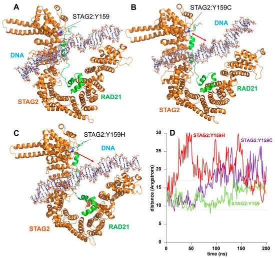 STAG2/DNA interaction: STAG2:Tyr159Cys and STAG2:Tyr159His variants. Model of the interaction of the STAG2-RAD21 dimer with a DNA molecule after 200 ns of MD simulation. (A) In the wild-type dimer, the position of the STAG2:Tyr159 (Y159) amino acid in a domain of STAG2 contacting the DNA molecule is indicated. (B) Model of the interaction of STAG2-RAD21 dimer with DNA in the case of the STAG2:Tyr159Cys (Y159C) variant. The red arrow indicates the separation between the DNA molecule and the STAG2 domain. (C) Model of the interaction of STAG2-RAD21 dimer with DNA in the case of the STAG2:Tyr159His (Y159H) variant. (D) Plot showing the variation of the distance from the alpha carbon of STAG2:Tyr159 (Y159, green line), STAG2:Tyr159Cys (Y159C, purple line), and STAG2:Tyr159His (Y159H, red line) to the nearest DNA phosphate group over 200 ns of unrestricted MD simulation. The distance in the case of the wild-type molecule ranges between 9 and 17 Å (dashed lines), whereas, in the case of both variants, the oscillation is much larger, reaching separation values of up to 30 Å.