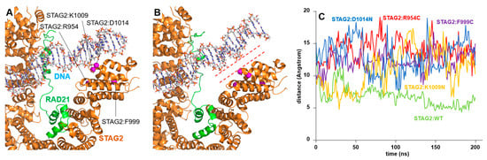 Six STAG2 variants are included in this group. Two of them correspond to a mutation in the same residue: STAG2:Tyr159Cys and STAG2:Tyr159His (Figure 5), while the other four are grouped on the other side of the DNA: STAG2:Arg954Cys, STAG2:Phe999Cys, STAG2:Lys1009Asn, and STAG2:Asp1014Asn (Figure 6). The amino acid STAG2:Tyr159 localizes to a region of STAG2 in contact with DNA, although the amino acid itself has no direct interaction with the nucleotide chain (Figure 5A). In the STAG2:Tyr159Cys and STAG2:Tyr159His variants, the amino acid changes are not particularly drastic because both the original amino acid (Tyr) and the variants (Cys and His) are all polar residues. However, the small changes associated with these substitutions seem to correspond to a greater flexibility in the local interaction between the protein moiety located close to the mutated amino acid and the DNA molecule. Figure 5B,C show an example of one of the separation moments between the DNA and the STAG2 domain during the simulation corresponding to the STAG2:Tyr159Cys and STAG2:Tyr159His variants, respectively. Figure 5D shows the variation, along the MD trajectory, of the distance between the alpha carbon of the STAG2:Tyr159 amino acid (or of the STAG2:Tyr159Cys and STAG2:Tyr159His variants) and the nearest phosphate group of the DNA chain at the beginning of the simulation. The graph shows how this distance remains within the range of 9 to 17 Angstrom for the case of the wild-type amino acid. On the other hand, in the two mutants, a much larger oscillation is observed, reaching values of up to 30 Å at some moments of the simulations (mean values of 19.69 ± 3.05 and 17.00 ± 3.44 Å for STAG2:Tyr159Cys and STAG2:Tyr159His variants, respectively, in the last 50 ns of the trajectory).