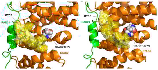 The interaction segment of CTCF with STAG2 consists of only nine amino acids located in the N-terminal domain of the protein [12]. Only one of the studied STAG2 variants, STAG2:Ser327Asn, is located near this binding site. Figure 9 shows the position of the STAG2-bound CTCF segment in the wild-type protein (left) and in the STAG2:Ser327Asn variant (right). Although no significant structural change is observed when replacing Ser with Asn (both are uncharged polar residues), the geometry of the CTCF segment interaction changes slightly during the MD simulation, moving away from the contact with RAD21.