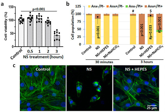 As well-known buffering agents to maintain pH, 25 mM HEPES or 0.5 mM sodium bicarbonate were added in NS. The pH level of culture media as a control was within physiological range (7.85 ± 0.009), whereas 0.9% NS recorded an acidic pH of 5.30 ± 0.017 (Table 1). There was no change in intracellular sodium after NS exposure after 30 min (Figure S3). Supplementation of HEPES or sodium bicarbonate in 0.9% NS increased the pH to 7.05 ± 0.005 or 7.30 ± 0.012, respectively. Interestingly, there was a minor pH change during the exposure of control and HEPES with chondrocytes, while the pH of NS and sodium bicarbonate buffer became 9.6% and 10.3% more acidic at 3 h, respectively. The effect of pH buffering was promising to reduce chondrocyte death. The rates of necrotic and late apoptotic cells were significantly diminished in both HEPES and sodium bicarbonate groups; however, the difference was notable at 3 h exposure (Annexin V/PI positive: 7.7% in HEPES vs. 52.6% in sodium bicarbonate) (Figure 1b and Figure S1a–d). Therefore, only the HEPES supplement was used for further studies. Phalloidin staining revealed the protection of cellular morphology when NS was supplemented with HEPES (Figure 1c).