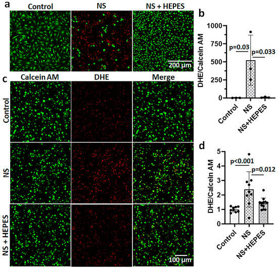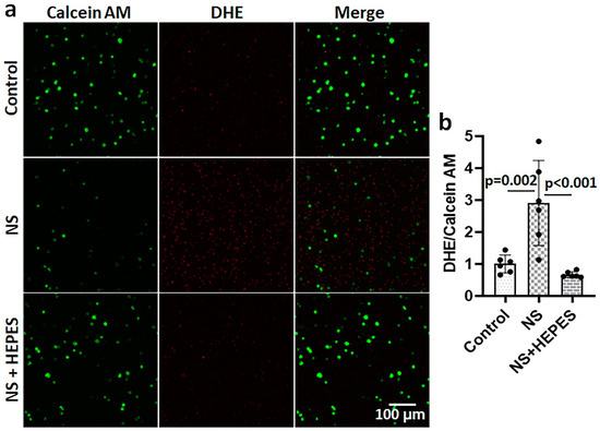 Chondrocytes treated with NS had an increased release of reactive oxygen species (ROS), as imaged by the DHE staining (Figure 2). The levels of ROS after 3 h of NS exposure were approximately 500-fold (p = 0.03 vs. control) and 2.4-fold (p < 0.001 vs. control) higher than control in 2D monolayer (Figure 2a,b) and 3D agarose culture systems (Figure 2c,d), respectively. In monolayer cultures, the addition of HEPES significantly reduced ROS levels (p = 0.033 vs. NS) (Figure 2a,b). Similarly, the DHE staining of chondrocytes encapsulated in agarose hydrogel was significantly decreased with HEPES addition (p = 0.012 vs. NS) (Figure 2c,d). In addition to chondrocytes, bovine synoviocytes exposed to NS showed a similar trend of ROS overproduction (Figure 3). The NS induced a significant 3-fold increase in ROS level by synoviocytes (p = 0.002 vs. control), while the addition of 25 mM HEPES supplementation negated this deleterious effect (p < 0.001 vs. NS).