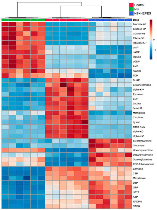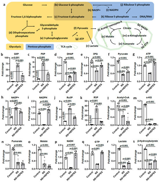 At least 2-fold up/down-expressed metabolites are listed in Table S1. Exploratory statistical analysis of the top 40 metabolites displayed in the heatmap with hierarchical clustering showed a clear divergence between control and NS as well as between NS and NS+HEPES (Figure 4). HEPES supplementation reduced the extent of alterations induced by NS in the glycolytic, pentose phosphate, and tricarboxylic acid (TCA) cycle pathways. NS induced an increase in intermediates in the glycolysis pathway (glucose 6-phosphate and fructose 6-phosphate) (Figure 5b and Figure 5c, respectively), whereas the levels of the final products, pyruvate and adenosine triphosphate (ATP), were significantly decreased (p < 0.001 vs. control) (Figure 5f and Figure 5g, respectively), an effect that HEPES mitigated (p < 0.001 vs. NS) (Figure 5f and Figure 5g, respectively). HEPES also significantly moderated the suppressive effects of NS on the levels of dihydroxyacetone phosphate (DHAP) and 3-phosphoglycerate (3PG) (Figure 5d and Figure 5e, respectively). NS exposure activated the pentose phosphate pathway (PPP) with a higher expression of ribulose 5-phosphate (Ru5P) and ribose 5-phosphate (R5P) (p < 0.001 vs. control) (Figure 5j and Figure 5k, respectively). Reduced nicotinamide adenine dinucleotide phosphate (NADPH) in the NS group was approximately 31-fold lower than in the control group (Figure 5i). HEPES addition induced full recovery of reduced nicotinamide adenine dinucleotide (NADH) and guanosine triphosphate (GTP) (p < 0.001 vs. control) (Figure 5p and Figure 5q, respectively). Lastly, NS caused a 7.2-fold reduction of lactate production (p < 0.001 vs. control) (Figure 5r). In contrast, levels were close to control in the NS+HEPES. TCA metabolites, including acetyl coenzyme A (acetyl-CoA) (Figure 5l), α-ketoglutarate (α-KG) (Figure 5m), fumarate (Figure 5n), and malate (Figure 5o), were significantly decreased relative to control in both the NS and NS+HEPES groups.