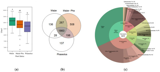 Bacterial richness in IC condition (a) Boxplots of Chao1 richness index values for means of maize and beans in SC and the IC condition (Plant Status). Letters above boxplot identify significant differences highlighted by Tukey HSD test. (b) Venn diagram of bacterial species belonging to each subset. (c) Doughnut plot of total bacterial diversity for the IC condition with percentages of phyla in the inner circle and of orders in the outer circle.