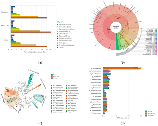 The rhizosphere of IC condition is mainly constituted by Proteobacteria (31%) with the orders Betaproteobacteriales, Myxococcales and Betaproteobacteriales (Figure 1c) enclosing the highest diversity within these phyla. Rhizosphere in IC shows an increment in relative abundances of Actinobacteria and Entotheonellaeota compared to maize and beans in SC, while Proteobacteria show an increment in IC compared to maize in SC but relative abundances are comparable to the one of beans in SC. Gemmatimonadetes and Acidobacteria have slightly lower abundances compared to SC (Figure 1a). The most abundant phylum in intercropping is Actinobacteria (40%) (Figure 2b) which is also identified as a biomarker for the intercropping system by LefSe analysis (Figure 2c,d, Table S4). Within Actinobacteria, the orders Propionibacteriales, Streptomycetales, Micrococcales and Corynebacteriales are reported as a biomarker of the IC system, thus they show higher relative abundances compared to SC conditions. At the phylum level, Entotheonellaeota also results as a biomarker of IC condition.