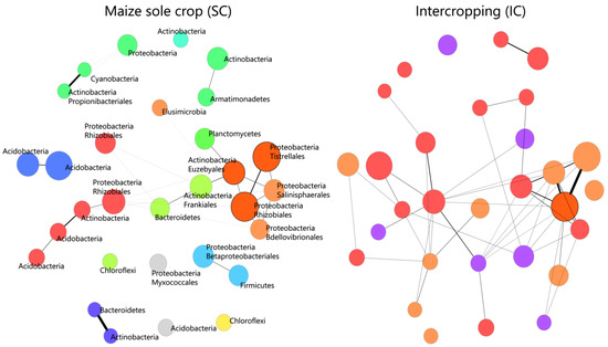 The role of Proteobacteria and Actinobacteria members in shaping the new configuration of the rhizosphere microbiome in IC is determinant also for the structure of the microbial network of IC compared to the one of maize in SC. Indeed, the microbial community structure in IC is significantly altered compared to the one of maize in SC and the taxa highlighted for being significantly differentiated mostly belong to the phyla Actinobacteria and Proteobacteria. In particular, seven Actinobacteria and nine Proteobacteria show a strong increment of connections in IC compared to maize in SC and, within differentially expressed taxa in IC, the one showing the highest number of connections in the new configuration is the order Rhizobiales. Significative increments are observed also for the Actinobacteria of order Frankiales, Propionibacteriales, Micromonosporales and Euzebyales but the strongest change in number of connections from SC to IC is recorded by a member of the class Deltaproteobacteria. When examining the network properties of the IC condition in contrast to those in SC, it becomes evident that IC exhibits a heightened complexity in its community structure, especially when compared to maize in SC. Indeed, while bean in SC shows a number of nodes and, above all, a number of connections nearer to the ones of IC, and maize in SC is instead characterized by significantly lower complexity (Figure 3). This may suggest that bean rhizosphere strongly influences one of the IC systems but that, at the same time, the IC condition favors a new microbial configuration characterized by a more structured and complex bacterial community which, in turn, can be associated with enhanced functional expression within belowground communities [69,70].