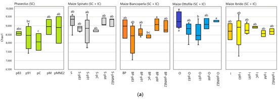 Bacterial community richness (Chao1 index) is significantly impacted by different IC combinations (“Accession”) within each “Environment” (bean lines in SC, maize lines in SC and respective IC combinations) (p < 0.005) (Table S3). Shannon index, instead, is not significantly impacted by different IC combinations. Within bean lines, pC shows a significantly lower richness compared to the other lines of P. vulgaris. The two lines p83 and p91 have lower richness compared to pM and pMNE2. Bacterial richness shows significant differences among the maize/bean combinations in the IC systems determined by the maize landraces BP and O. Means of Chao1 index values for maize lines intercropped with p83 and p91 show similar behavior with a decrement of the bacterial richness, while IC combinations with pM and pMNE2 there is an increment of the bacterial richness. This trend resembles the one observed for the corresponding lines of Phaseolus in SC and is maintained in all the “Environment” except for the one determined by maize line I (Figure 4a).