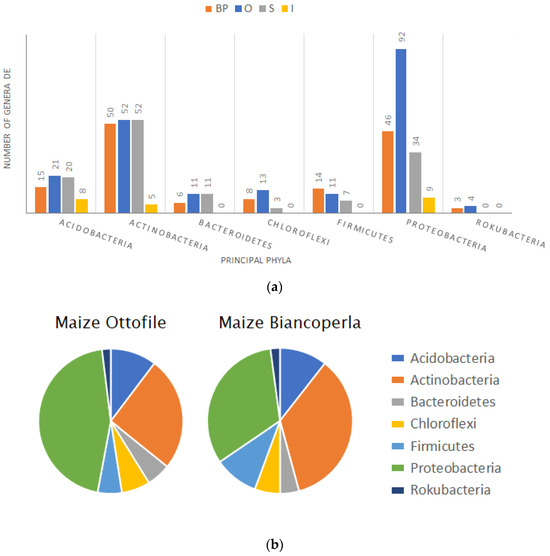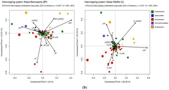 CPCoA analysis on Bray–Curtis matrices identified a significant differentiation of the bacterial communities determined by the most contributing phyla in the rhizosphere of IC combinations with BP (p value < 0.035) and O maize lines (p value < 0.012). In both cases, centroids of maize lines in SC (BP, O) clusters separately from their IC combinations. The space identified by abundances of bacterial taxa belonging to the most contributing phyla highlights a trend for which IC combinations with BP and O are mostly located where there is a condition of higher abundances and diversities of the microbial community. Interestingly, centroids of maize BP intercropped with p83 and p91 are nearly overlapping and centroids of maize O intercropped with p83 and p91 are located in a space with similar bacterial composition, even if the first is dominated by Actinobacteria and the second by Proteobacteria. In general, for IC “Environments” determined by BP and O maize lines, it seems that IC combinations with p83 and p91 tend to cluster in the same bacterial community space, while the behavior of IC combinations with pM and pMNE2 diverges. Possibly, centroids of these combinations fall in a space determined by relative abundances of diverse phyla, which may contribute less to the bacterial community composition of maize/bean intercropping as a whole but which enclose the higher diversity highlighted by the Alpha-diversity index. In all “Environments”, bacterial communities are dominated by the presence of Actinobacteria and Proteobacteria (Figure 4b and Figure S3). Permanova (Table 2) shows that Plant status had no significant effect on Bray–Curtis within each “Environment”, but a significant effect of “Accession” is observed in BP and O IC systems, suggesting that significant differentiation is dependent on specific combinations between maize and bean lines.