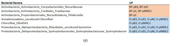 The majority of bacterial genera differentially expressed (DE) are downregulated in single IC combinations compared to plants in SC (Figure S4). Down-regulated taxa account for relatively small abundances while up-regulated taxa have higher relative abundances, in particular for IC combinations with BP. Taxa differentially expressed mostly belong to phyla Actinobacteria and Proteobacteria and some recurrent bacterial taxa are up-regulated in different IC combinations compared to their maize counterpart in SC. Among bacterial genera DE that are upregulated in IC compared to SC are especially present members of the phyla Actinobacteria, Proteobacteria, Planctomycetes and Chloroflexi. IC combinations with BP and O are the ones showing the highest number of DE bacterial genera (Figure 5a). BP rhizosphere in intercropping conditions shows enrichment of bacterial genera belonging to the phyla Actinobacteria, while O in intercropping is enriched of bacterial communities belonging to the phyla Proteobacteria (Figure 5b). Bacterial taxa that are recurrently upregulated in different IC combinations with maize lines BP and O are reported in Figure 5c. These members of the bacterial communities may have a pivotal role in shaping the bacterial communities in intercropping conditions.