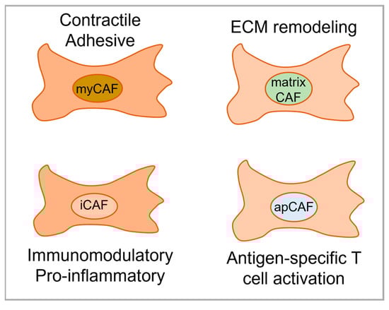 Pancreatic ductal adenocarcinoma (PDAC) has been the primary subtype of focus of CAF research in pancreatic malignancy, with several authors having delineated CAFs into myCAFs and iCAFs [8,9,10,58]. These two subpopulations of CAFs have been identified using immunofluorescence (IF), IHC, and microscopy [10]. Using scRNA-seq, 962 fibroblast cells could be analyzed in vivo and two distinct subclusters could be formed with unique gene signatures [9]. The subcluster 1 had enriched expression of Il-6 and Il-8 and chemokines such as Cxcl1, Cxcl2, Ccl2, and Cxcl12, and was identified as iCAFs. The IL-6 expressing iCAFs were located far away from neoplastic cells in the desmoplastic stroma according to IHC [10]. The αSMA positive subcluster 2 was identified as myCAFs and spatially distributed in direct proximity to neoplastic cells forming a periglandular ring surrounding the clusters of cancer cells [9,10]. Using Gene Set Enrichment Analysis (GSEA), enriched pathways could be identified enclosing an upregulation of inflammatory pathways such as IFNγ response, TNF/NF-κB, IL2/STAT5, IL6/JAK/STAT3, and the complement pathway in iCAFs, while myCAFs displayed an upregulation in pathways such as smooth muscle contraction, focal adhesion, ECM organization and collagen formation. Biffi et al. further revealed IL1 to be critical for generation of iCAFs [8]. When analyzing PDAC tumors in Kras+/LSL-G12D; Trp53+/LSL-R172H; Pdx1-Cre (KPC) mice, a new subpopulation—namely, apCAF—were described [9]. These MHC II-expressing and Cd74-expressing apCAFs could activate CD4+ T cells in an antigen-specific fashion based on use of an ovalbumin-specific TCR transgenic OTII mouse model. An apCAF subtype has also been suggested by Zhang et al. in HNSCC [62].
